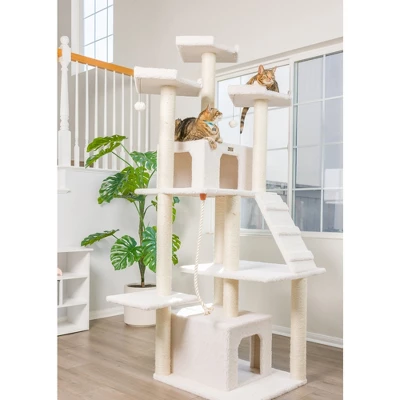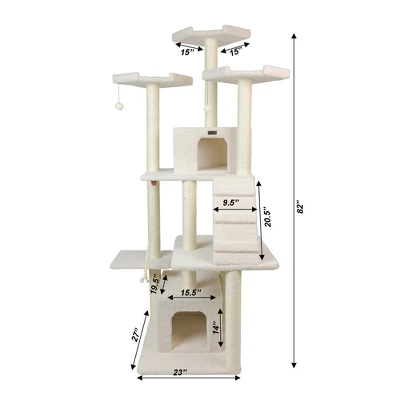 Able to handle 100 pounds with ease, owners of multiple cats will appreciate Armarkats model B8201 classic cat tree. It features two condos, a ramp, three perches, and a rope swing to keep cats busy for hours.F & B bullet:82″ height cat tower in ivory faux fleece, suitable for medium and large cats.The fleece coverings are permanently adhered to wood structures, easy to clean and goes with furniture.Well constructed of 15mm pressed wood material, making it not only thicker but stronger and keep it in shape.100% Natural, seasoned sisal rope wraps all posts securely for years of scratchingDimensions:base Dimensions:28″ x 24″; condo Dimensions:20″(L) x 16″(W) x 14″(H) and 20″(L) x 16″(W) x 12″(H); perch Dimensions:15″ x 15″ post diameter: 3.5″ maximum holding weight: 100 lbsSix-month warranty included.Replacement parts available from the manufacturer.