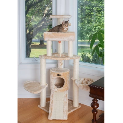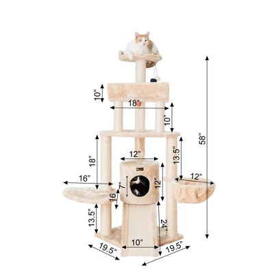 Four levels of fun await your felines with the new Armarkat 58 in Classic cat tree. Cat Daddy Approved by noted cat behaviorist Jackson Galaxy,furnished with Cradle, lounge basket for rest. F and B Bullet:58″ height cat condo comes with high density faux fleece cover for felines’ comfort and softness.The fleece carpet is permanently adhered to wood board which sustains long lasting scratching.Well constructed of 15mm pressed wood material, making it not only thicker but stronger and keeping it in shape.100% natural, seasoned sisal rope wraps all posts securely for years of “scratch”.Dimensions:House: 12″ x 12″; Base: 19″ x 19″;.Basket: 12″ diameter; Perch: 14″ x 14″.Post Diameter: 3.5″. Maximum Holding Weight: 40 lbs. Six-month warranty included.Replacement parts available from the manufacturer.