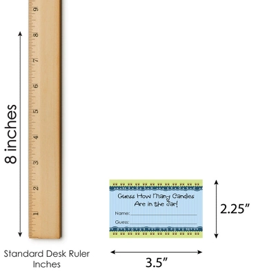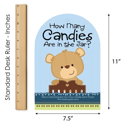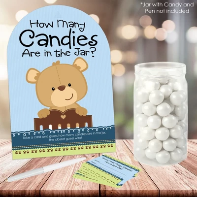 Baby Boy Teddy Bear Candy Guessing Game INCLUDES 1 sign with a built-in stand and 40 guessing cards that will look great at your Baby Shower. Sign measures 7.5” wide by 11” tall and cards measure 3.5” by 2.25” tall. Candy and jar are not included. HOW TO PLAY: Draw attention to your candy jar with the Baby Boy Teddy Bear Candy Guessing Game! Place the sign and cards next to your candy jar. Guests can then take a card and guess how many candies are in the jar. The closest guess wins! EASY ASSEMBLY: To use, fold the sides of the stand towards the center. Then, fold down the support piece of the stand until it rests in the notches. Finally, display your Little Bear sign next to your container of candy. HIGH-QUALITY SUPPLY: Baby Boy Teddy Bear Candy Guessing Game is professionally printed double-sided on sturdy cardstock paper with a photo-like shine. They are individually inspected and then carefully packaged by hand. Sign arrives flat with some easy assembly required. MADE IN THE USA: Baby Boy Teddy Bear Candy Guessing Game is designed and manufactured at our Wisconsin facility using materials that are Made in the USA.