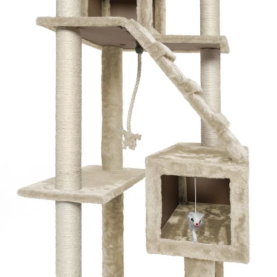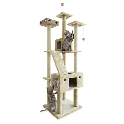 Your cat will love the FurHaven Tiger Tough Double Decker Playground cat tree! The bottom base is large and sturdy, and to keep it interesting, the fabric-covered cat shelves, and the cat houses, come in different shapes and sizes. Your kitty will get plenty exercise jumping, stretching, and playing on this amazing piece of cat furniture. The Double Decker Playground cat tree is easy to clean by spot-washing with a damp cloth and vacuuming it when needed.Dimensions: 19.7″ x 19.7″ x 69.3″Recommended Maximum (static) Weight Capacity: 18 lbs