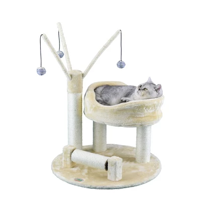 Plush elevated bed gives your cat a special spot to sleep and lounge. A sisal-wrapped, rotating scratching post keeps mischievous claws occupied, offering a constructive outlet for your kitty’s natural urge to scratch while the 3 dangly balls engage him in a little physical activity!. Don’t be surprised when this piece immediately becomes your cat’s favorite place to lounge and play!|DIMENSIONS : * Overall Size : 21″W x 23.5″L x 34″H *