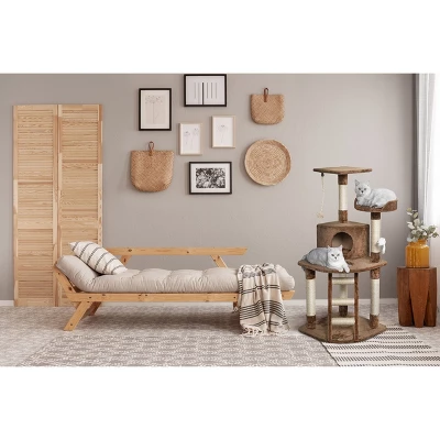 Trust us…your kitty can’t wait to sink into this plush cat tree condo. Available in several colorways, this gorgeous cat tree takes pet furniture to a new level. A ladder leads to the cozy, second story condo—the perfect spot for your cat to retreat and relax. With 5 sisal wrapped scratching posts, a hanging toy, a dangling sisal rope, and a lookout perch, this cat condo features all the amenities your feline needs to feel right at home. |Overall Size : 32″W x 25″L x 47.5″HBase Board Size : 27″W x 25″LSize of Condo : 17″W x 14″L x 9.5″HTop of Bed : 14″Diameter x 3.5″HTop of Perch : 14″W x 14″L