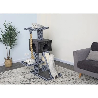 Our 49” Sequoia Cat gives your cat her very own escape while gifting you with a stylish home addition. This multi-level tree is designed in a black and gray patterned carpet and features a soft faux-fur finish for cloud-like comfort. The condo provides your pal with the safety and security she needs to sleep soundly and the flat platforms offer the elevation your kitty craves when perching. A thick dangly rope encourages mental stimulation and play while the sisal rope-wrapped post and ramp scratcher engage your feline friend in some scratching fun so she will spend less time clawing at your furniture!|Overall Size : 30.5”L x 32.5”W x 49”HBase Board Size : 20”L x 29”WTop Perch : 14.5”L x 20”WCondo House : 17.5”L x 17.5”W x 11.5”HRamp Scratching Board Size : 27”L x 8”W (Sisal Fabric)One Big Giant Rope Size : 3” DiameterHuge Posts (5.5” Diameter) covered by natural sisal rope & carpet