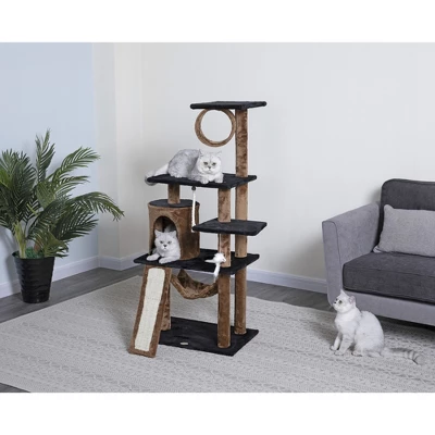 There’s no end to the adventures your kitten can have on this exciting cat tree. From a hammock to a tunnel to engaging hanging toys, your furry feline is guaranteed to love their new retreat. Watch them sharpen their climbing skills on multiple levels of perches, relax in their cozy condo space or scratch and stretch against the natural sisal scratching pad.|Overall Size : 28.5″W x 23″L x 53.5″HBase Board Size : 24″W x 16″LSize of Condo : 9.5″Dia x 12″HTop Perch : 12″W x 12″L