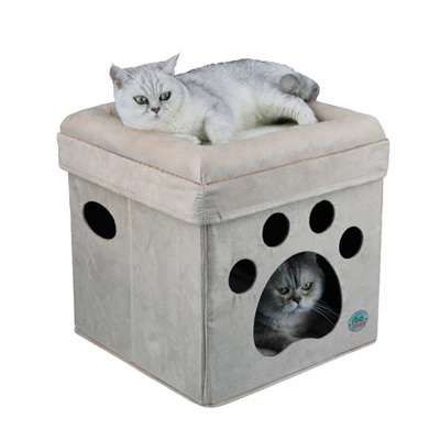 Designed as a peaceful sanctuary for your furry feline after a day of play. It offers a great hiding spot for your cat to sleep and unwind. The cat hide-away comes in two different designs one in the shape of a paw and the other in the shape of a cat. The top bed is lined with wool with surrounding deluxe bolsters to rest upon. A spacious interior with luxurious wool padding that allows your cat to relax and play through the two peek-a-boo cut outs. The Comfy Cat Cube by Go Pet Club is fast and easy to assemble and collapsible for convenient storage. It is engineered to be strong able to withstand 100 pounds. It is perfect for cats in any life stage.|DIMENSIONS : • Size : 16″L x 16″W x 16.5″H• Entry-way measures: 8″W x 6″H