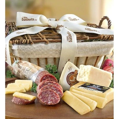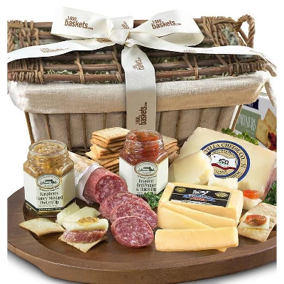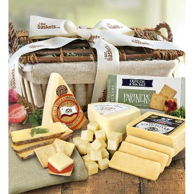 Share the bounty of farm fresh cheeses that were made in America and brought to you by premium cheese masters. Indulge someone who’s very special with mild and buttery Bellwether Farms Carmody, aged Vella Mezzo Secco Monterey Jack Cheese, and sharp Fiscalini Aged Cheddar Cheese – all are unbelievably rich and delicious. With 3 such dramatic and distinct cheeses, how will they ever decide which one they love most! Presented in a pastoral, covered willow basket with fabric liner and includes a stainless steel cheese knife. Basket includes: Bellwether Farms Carmody, Vella Mezzo Secco Monterey Jack Cheese, Fiscalini Aged Cheddar Cheese, and Partners Olive Oil & Sea Salts Crackers. The gift arrives in a covered Willow Basket with Fabric Liner, and includes a stainless steel Cheese Knife. Gift Measures 6”Hx8”Wx13”L