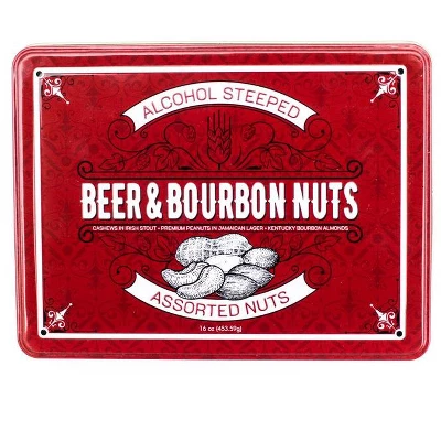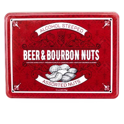 Nut lovers rejoice! The Trio of Liquor Nuts Gift Tin contains 16oz of three delectable flavors that are an absolute taste sensation. Addicting and sweet, but not too sweet! Our unique twist on classic bar snacks will revolutionize nut snacking. Nuts are steeped in alcohol for maximum flavor. This gift contains: mouth-watering, hand-crafted Irish Stout Beer-flavored cashews Jamaican Lager Beer-flavored peanuts Tennessee Whiskey-flavored almonds