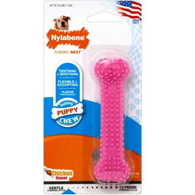 Nylabone Puppy Chew Dental Bone Chew Toys are safe, beneficial and entertaining chews for teething puppies. Like all dogs, puppies have a natural urge to chew, and these bone shaped toys provide an outlet that keeps your furniture, shoes and slippers safe. Bristles that rise up during chewing also help to clean teeth and control plaque and tartar for a healthy mouth. And the delicious chicken flavor means your pup will never say no to a chew!