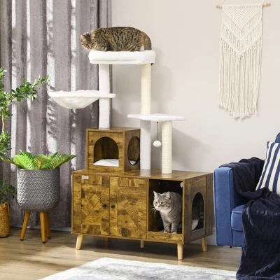 By merging a cat tree and a cat litter house, this design brings the heights cats love together with a better-looking bathroom. Made with farmhouse style and beautiful details, our furniture adds natural rustic charm to your interior design. With a PawHut play tower, your animals get several cozy nap spots, an array of areas to dig their nails into, and their own private bathroom. When you give a pet a PawHut, you gift your feline companion quality time and daily joy.