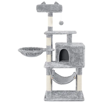- Your cute cats need a comfy place to relax, rest and play. This multiple-level cat tree is definitely their dreamland. Covered by plush and constructed of solid boards and connected with metal accessories, this cat house will not let you and your furry friends down. From the structure, our cat house has a roomy condo, top perch and platform, several scratching posts, a basket cradle and a lower hammock. Give your cat a cozy and interesting experience!