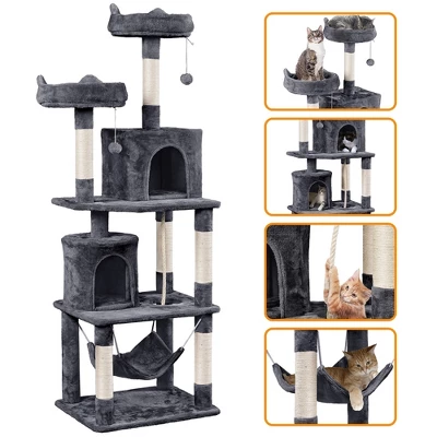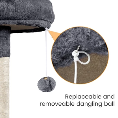 - This all-in-one cat tree we specially designed for your medium/large feline friends combines entertainment with leisure – it got 2 padded perches with raised edges, 2 roomy condos, 1 soft hammock, 2 detachable dangling balls, 1 sisal twine, and 6 sisal rope coiled scratching posts. Constructed of CARB Phase 2 compliant particle board, natural sisal, and pet-friendly soft plush fabric covering, this cat furniture gives your cats a safe and comfy lounge. It can house 2-3 medium/large cats.