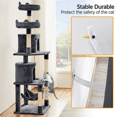 - 【Safe And Stable】The 24″ L x 19″ W baseboard makes the whole cat tower stable. Also, it comes with a safety strap to help prevent damage and injury from intensive jumping and leaping by securing the cat tree to the wall.